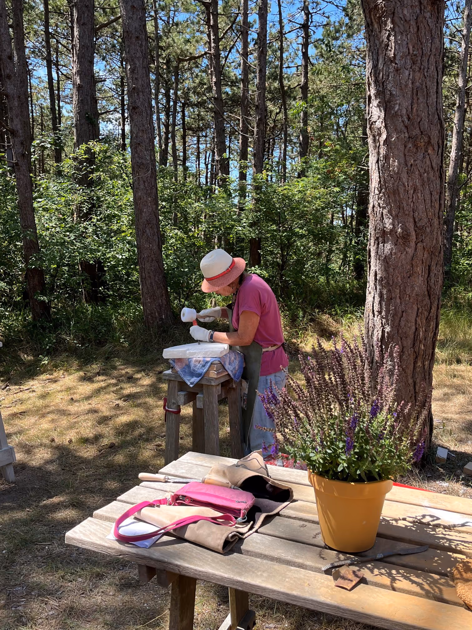 Bij mooi weer werk je heerlijk buiten tussen de bomen en anders op een goed beschutte plek in een open binnenruimte.
